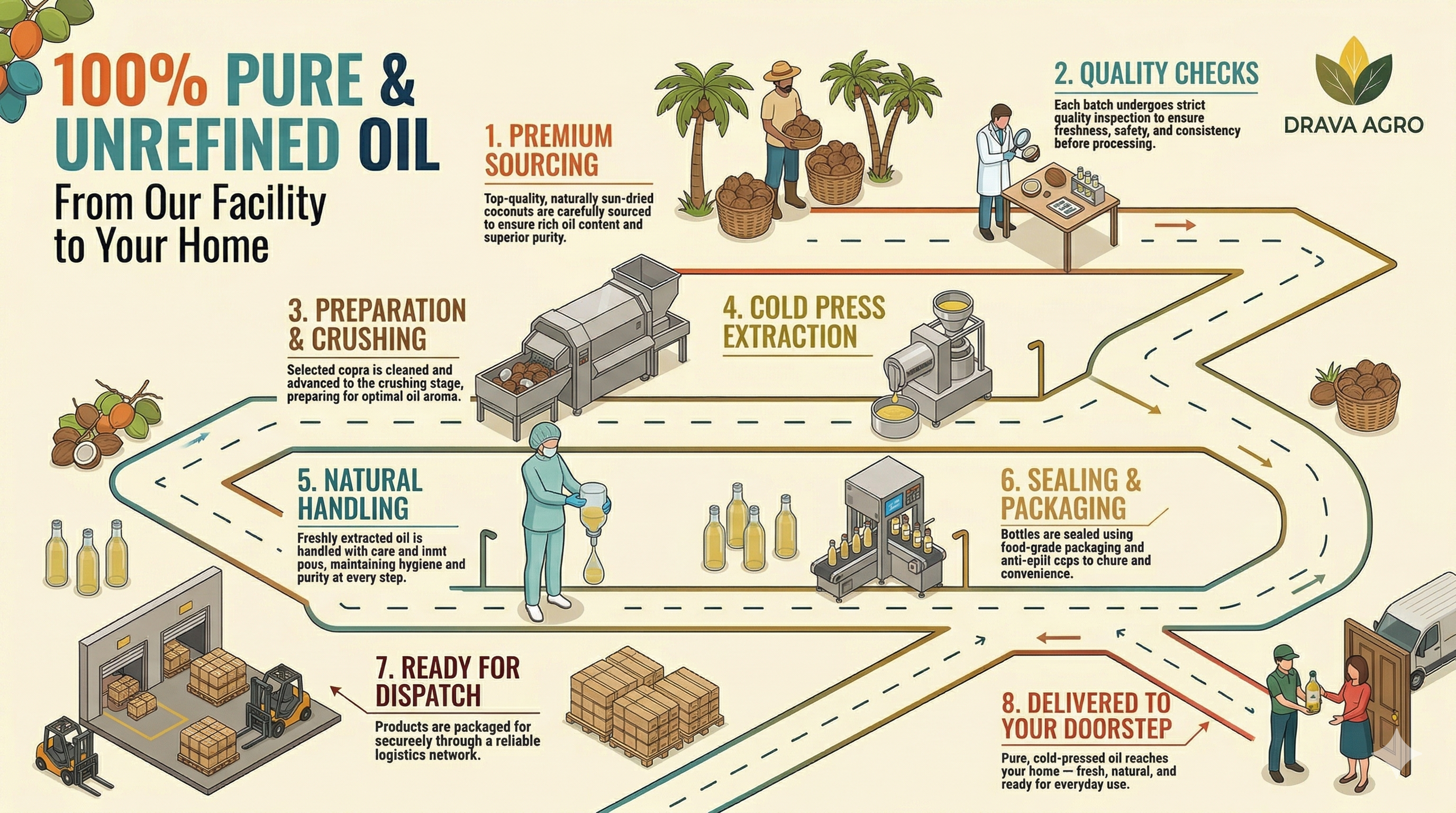 At Drava Agro, we believe in preserving the natural goodness of coconuts through our traditional coldpress method. No heat, no chemicals — just pure extraction that maintains all the nutrients, aroma, and flavor nature intended.